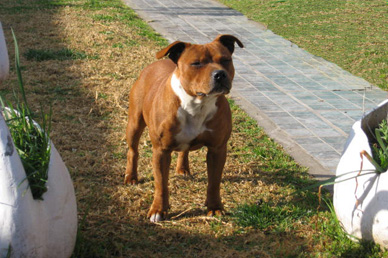 Raza originaria de Staffordshire, Inglaterra. Obtenida de la mezcla de Bulldog con terriers de la época. Es una raza con más de 200 años de historia; en mayo de 1935 se fundó el primer Club de Staffordshire Bull Terrier (The Staffordshire Bull Terrier Club) en el que se fijó su nombre y su estándar. El aspecto general de la raza ha cambiado considerablemente hasta la actualidad.